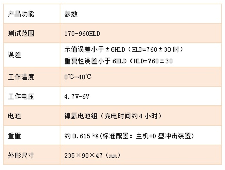 基本配置:主机(含打印机)1台、D型冲击装置1支、小支撑环1只、尼龙刷1只、标准里氏硬度块1块、充电器1只、打印纸1卷。