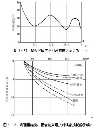 耦合层材料本身的透声性能和探测面的粗糙度也是影响耦合损耗的因素。图3–36为使用不同声阻抗耦合剂时,工件表面粗糙度对回波高度的影响,横坐标为表面粗糙度的平均高度RZ,它决定了耦合层的厚度,即d=RZ。